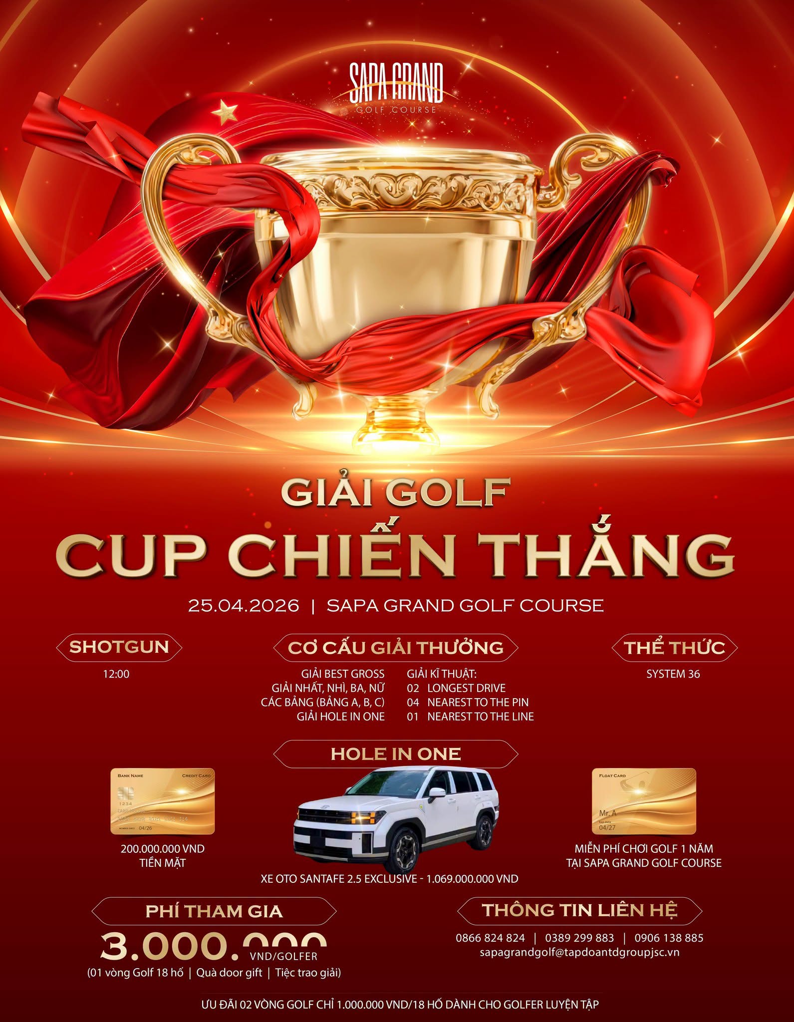 Giải golf cúp Chiến Thắng 2026 sẽ diễn ra vào Thứ Bảy, ngày 25/04/2026 tại Sapa Grand Golf Course. Tọa lạc ở độ cao lý tưởng, Sapa Grand Golf Course mang đến trải nghiệm độc đáo khi golfer thi đấu giữa biển mây và những dãy núi trùng điệp. Địa hình sân uốn lượn, giàu thử thách, đòi hỏi sự chính xác, chiến thuật và bản lĩnh của người chơi. Giữa không gian thiên nhiên hùng vĩ, mỗi cú đánh trở thành một hành trình chinh phục nơi cảm xúc thăng hoa cùng tinh thần thể thao và niềm tự hào dân tộc.