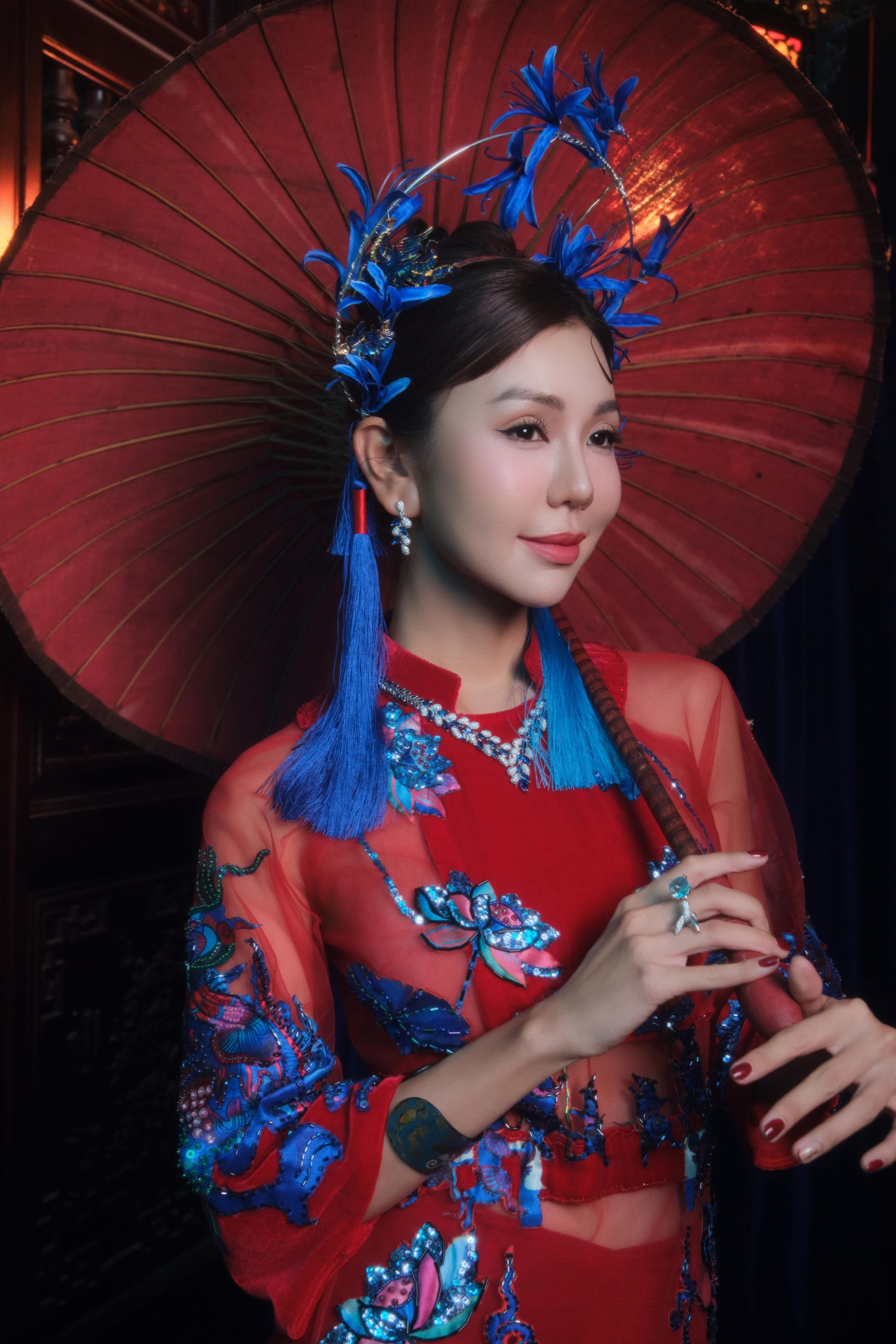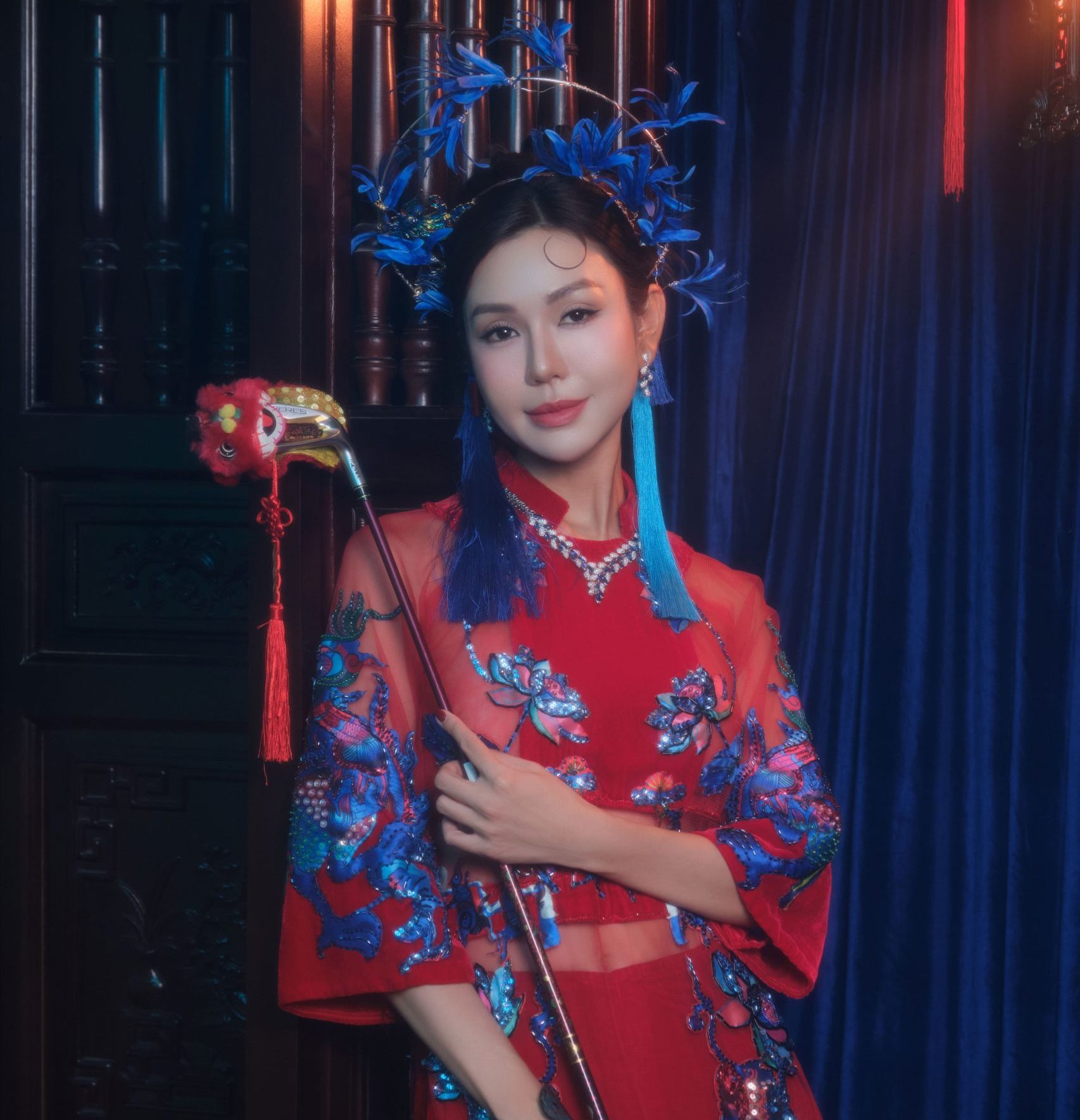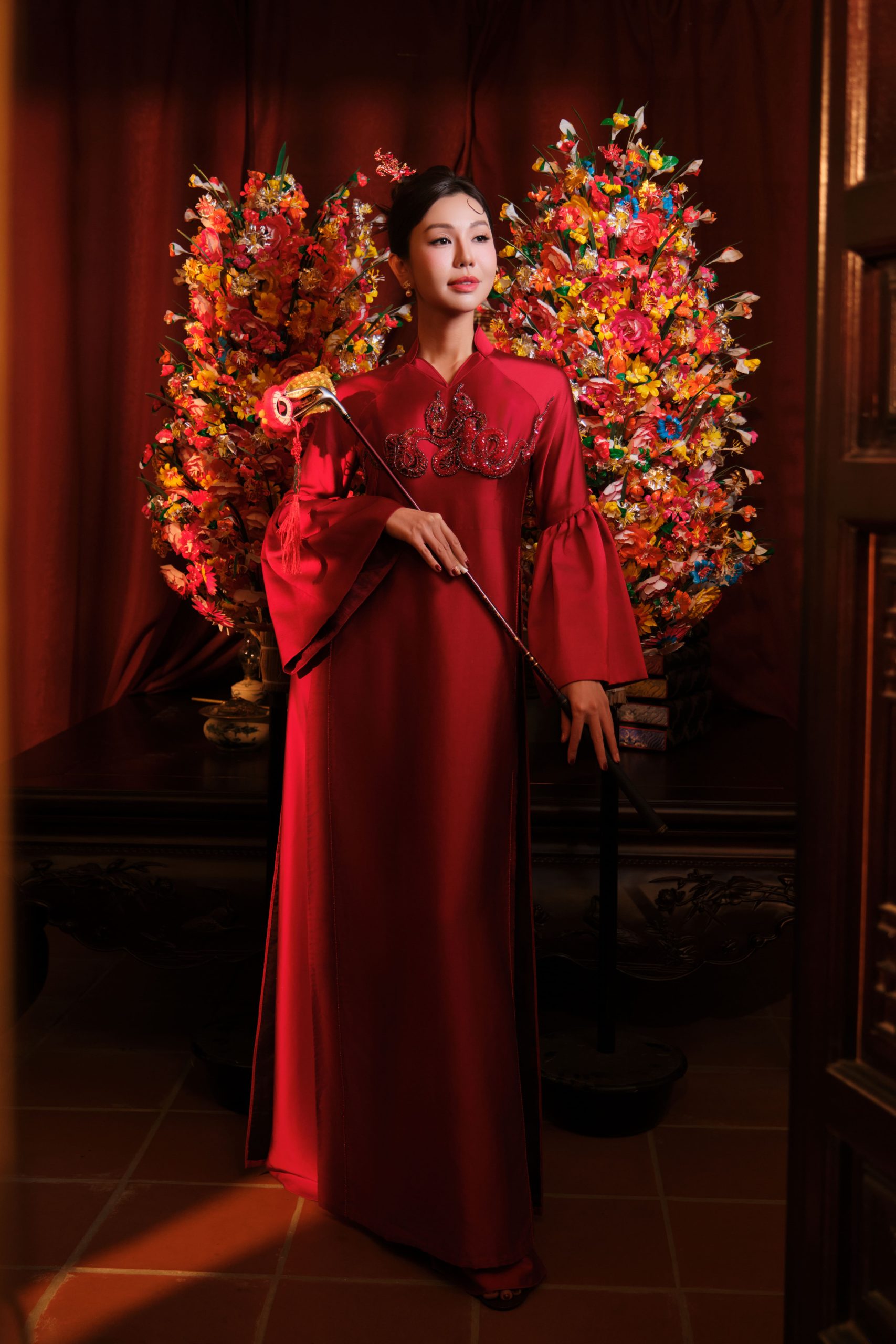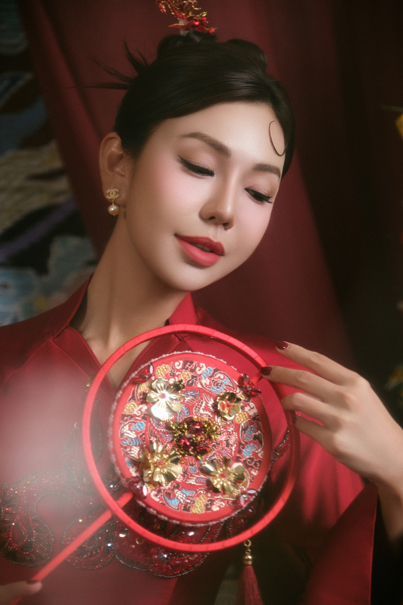 Lấy cảm hứng từ mùa trăng tròn – biểu tượng của sự đoàn viên và ký ức tuổi thơ, concept đầu tiên tái hiện chiều sâu văn hoá truyền thống. Hoa giấy Thanh Tiên, gối trái dựa cung đình Huế, mâm ngũ quả bên bình men lam… được sắp đặt khéo léo, làm nền cho hình ảnh nữ MC rạng rỡ trong tà áo dài đỏ thắm, ôm gậy golf dưới ánh trăng rằm. Ở đó, gậy golf – biểu tượng nghề nghiệp quen thuộc – không chỉ là công cụ thể thao, mà trở thành đạo cụ nghệ thuật, tạo nhịp cầu nối giữa truyền thống và hiện đại.