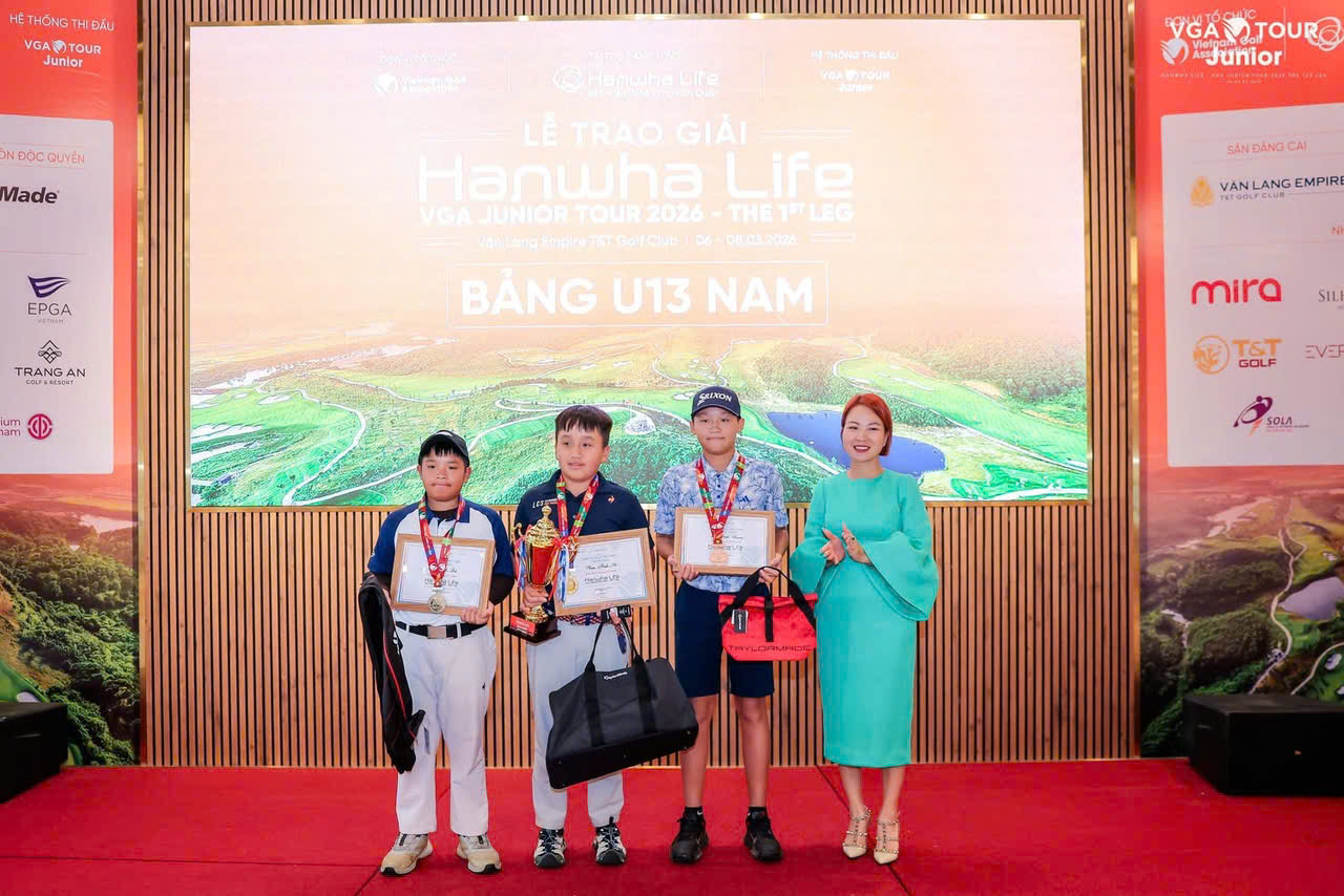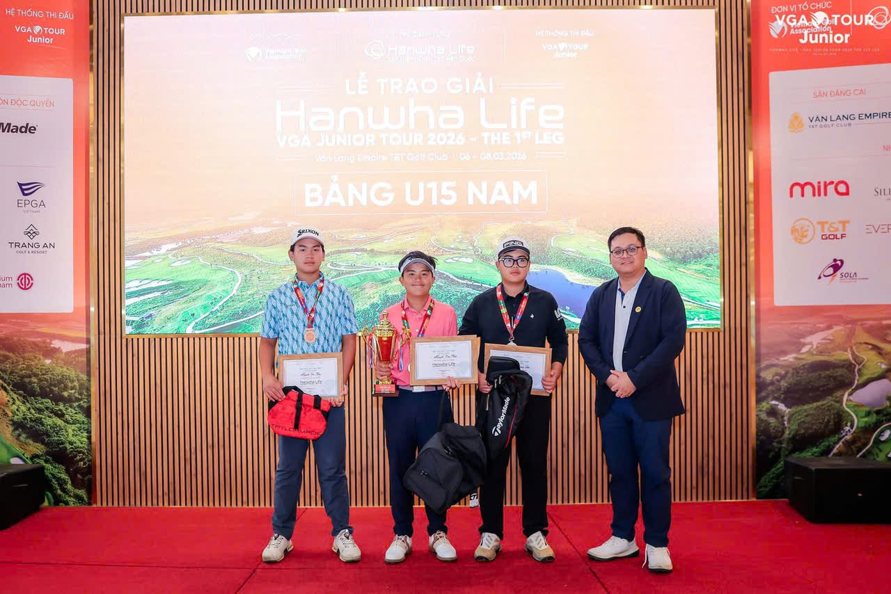 VĐV Nguyễn Văn Hoà đã xuất sắc giành ngôi vô địch chặng 1 Hanwha Life - VGA Junior Tour 2026 sau màn trình diễn ổn định xuyên suốt ba ngày thi đấu tại Văn Lang Empire T&T Golf Club. Golfer trẻ đến từ Hải Phòng hoàn thành giải đấu với tổng điểm (-5) sau ba vòng 71-69-71, qua đó tạo khoảng cách 3 gậy so với người xếp thứ hai là Nguyễn Bảo Phát.
